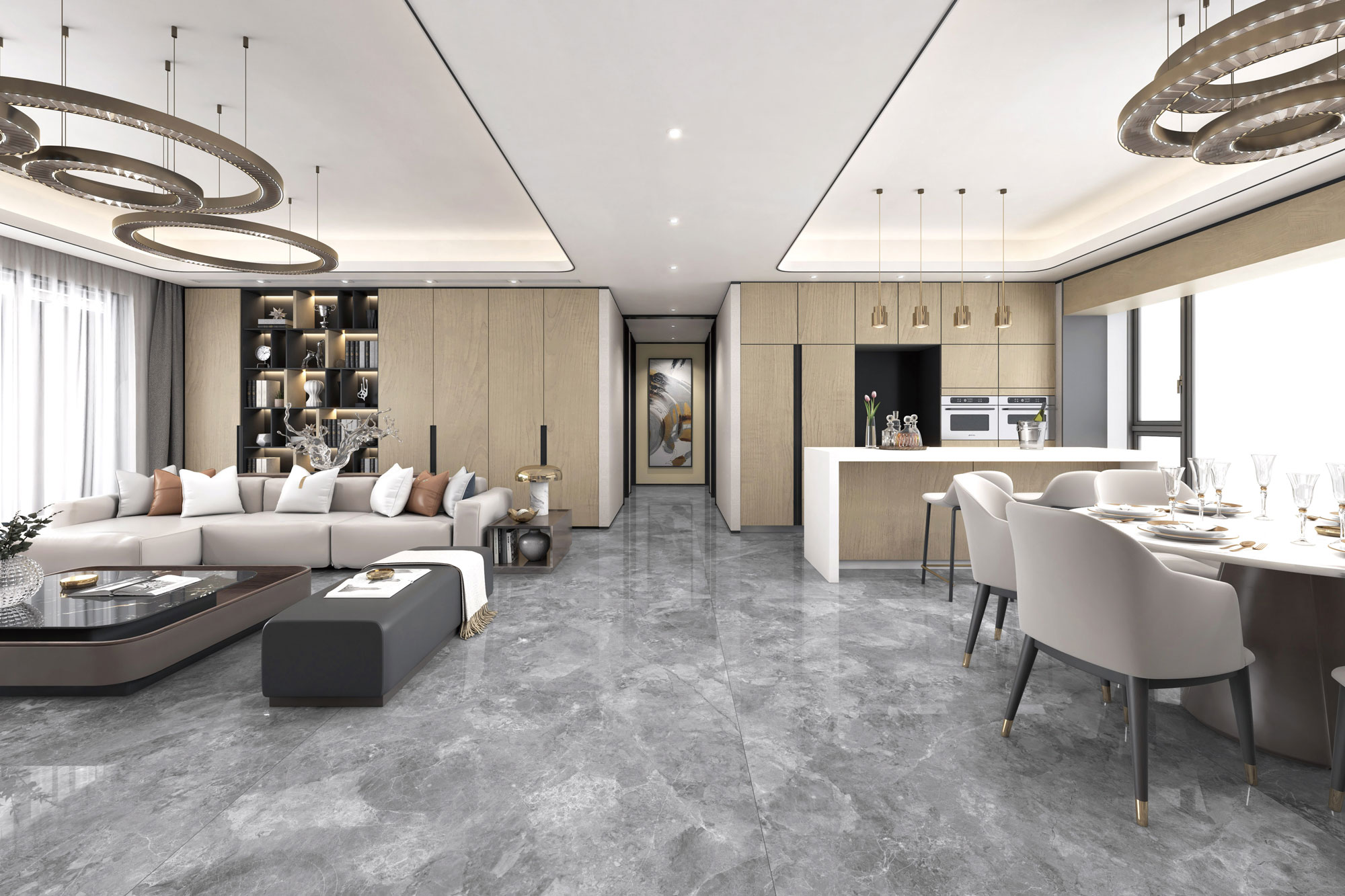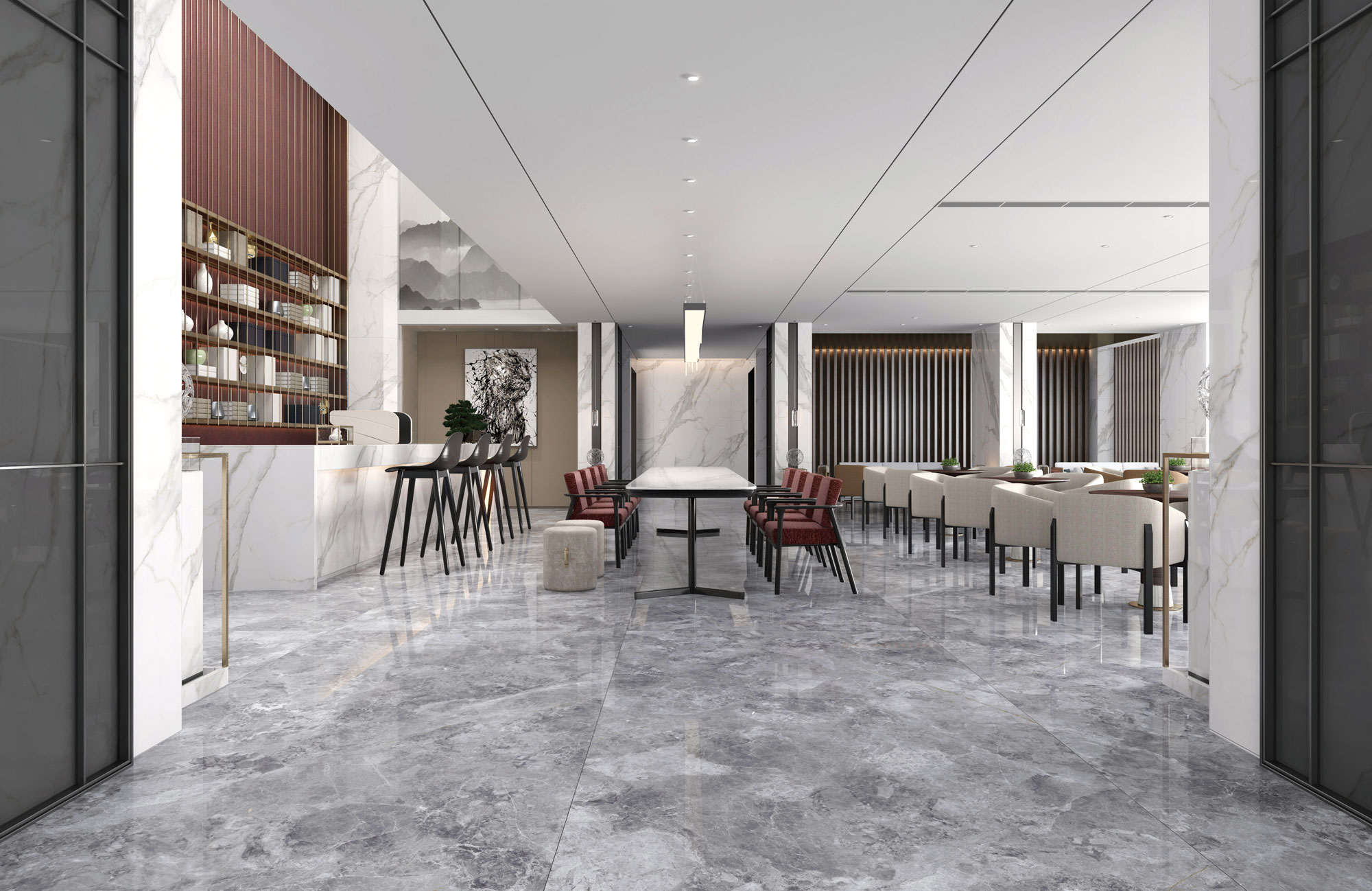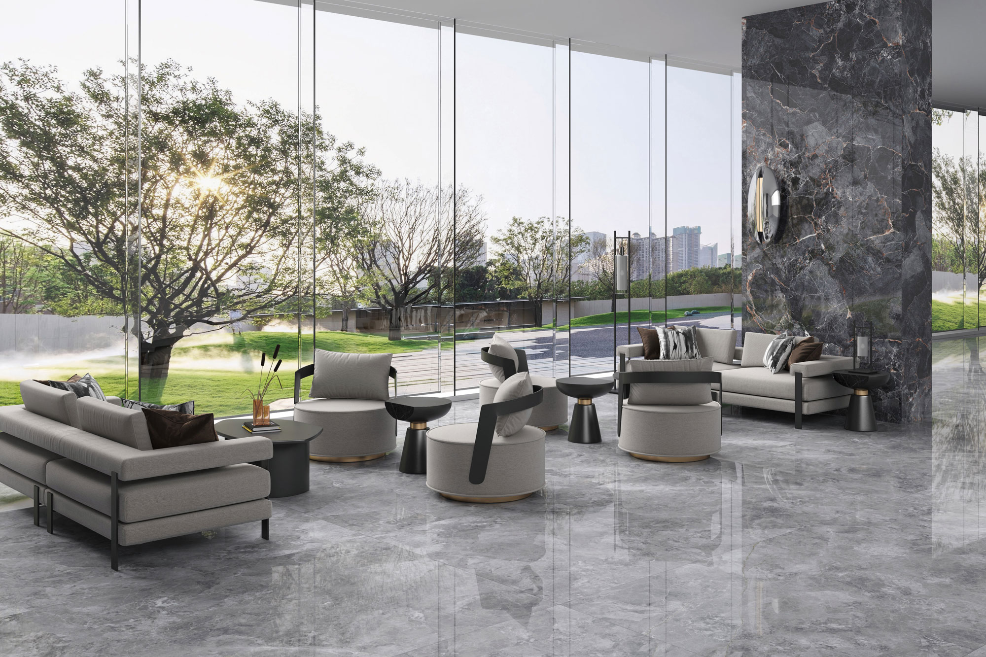 從青海湖的茶卡鹽湖汲取靈感,通過先進的工藝還原石材的肌理,底色濃淡深淺的灰色裹挾著自然變幻的石材紋理,在其中翻滾流動,猶如自然光折射在茶卡鹽湖上的波光粼粼,深邃的意境與質(zhì)感營造出靜謐、高貴。